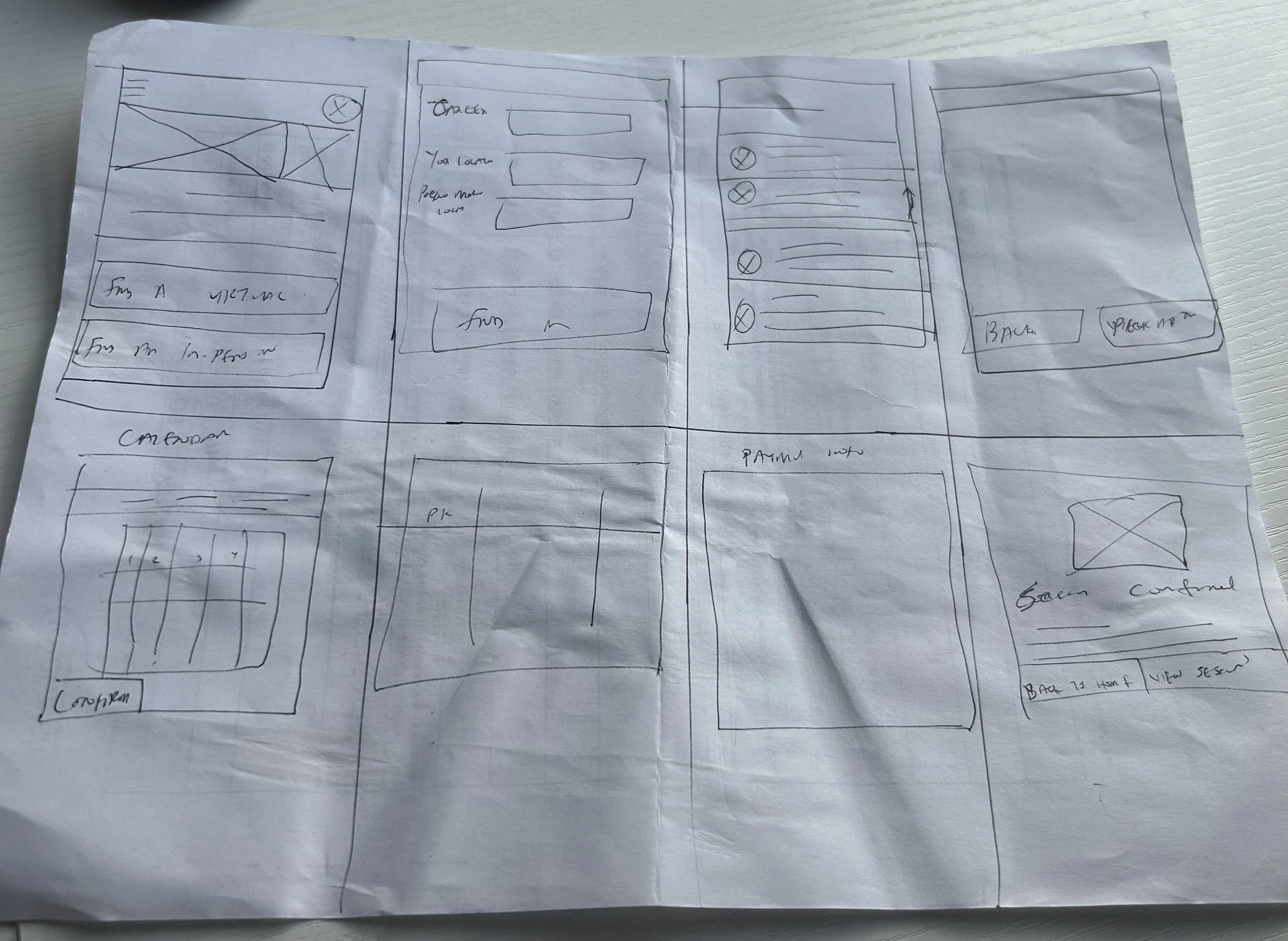The digital wireframe builds upon the foundational user journey outlined in the paper version, bringing structure, hierarchy, and visual clarity to each interaction. Designed with usability in mind, each screen is clean and intuitive, guiding users from selecting their preferred coaching mode to filtering options and reviewing coach profiles. Key elements like pricing, credentials, and availability are made easily scannable, while the booking and payment process remains streamlined. The goal is to create a smooth, personalized experience that reduces cognitive load and builds user trust.