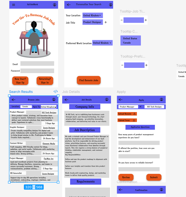 The lo-fi prototype presents a simplified, low-fidelity version of GoTeleWork’s user interface, focusing on core structure and flow without detailed visuals. It enables early testing of key functionalities—such as personalized search filters, job result sorting, and the application process—allowing for quick feedback on usability and navigation. By prioritizing layout and user interactions over aesthetics, this prototype helps identify potential improvements before moving to higher-fidelity designs, ensuring a user-centered approach throughout development.